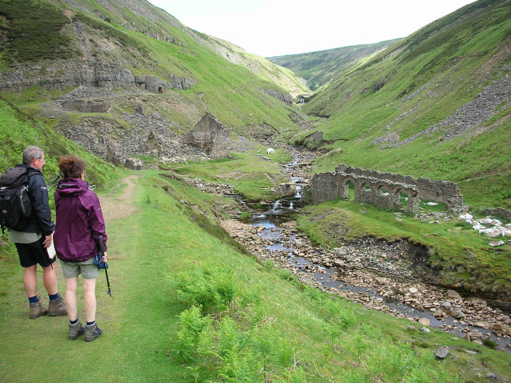 Tuesday 20 June - Keld to Reeth I awoke at 6am as the sun was shining in through my bedroom window. I opened the curtains and looked across the buttercup meadows down to Keld village and the River Swale. I could see part of today’s route and as I sipped my early morning cup of tea I recorded in my notebook ‘What a view! What a privilege!’ Yes I was once again feeling great and ready for today’s walk. The next couple of hours seemed to pass by quickly as I organised my kit, filled my hydration system with water and prepared for breakfast. We had breakfast at 8am and yes, it had to be the full English – Doreen Whitehead style of course - and it was excellent. I settled my bill and collected my substantial packed lunch from Doreen promising to return as soon as I could with my wife. – Linda enjoyed walking in the Dales and I know she would love the area around Keld in Swaledale. I set off a short time in front of the KK who were taking the scenic valley route via Gunnerside. I suggested a couple of places for the visit on the way to Reeth and told them I would see them in Reeth – we were all staying at Hackney House that evening. I walked down into the village and crossed the footbridge over the Swale. Here the Pennine Way turns left and the C2C routes go right towards Crackpot Hall. It was on this stretch up to Crackpot Hall that I caught up with Bill and Marie who were changing outer clothing. It looked like it may rain today but as it turned out there were only a few spots being blown across in the westerly wind in good visibility. I asked Bill and Marie if I could join them and we walked and talked around Swinner Gill and onward towards Blakethwaite mine ruins and then beyond to the Old Gang Smelting Mill etc. Bill and Marie were great company and passionate walkers with quite a few long distance walks under their belts. We all kept looking back for other walkers as we firstly descended and then ascended one of the three ‘ravines today. We were expecting to see Gordon and Charlotte but no luck. As we negotiated the steep descent to and then ascent from Blakethwaite ruins we saw Tim coming down the other side and expected him to catch us up but we didn’t see him until Reeth – he later explained that he had wandered off exploring the old lead mining area – he wasn’t lost just enjoying his time on the hills. There was a male solo wild camper on a small area of grass in the middle of the ruins and we waved to him as we passed. As we descended towards Surrender Bridge I bagged the Hard Level geocache whilst Bill and Marie did another upper clothing change. We continued steadily up the hillside beyond Surrender Bridge and as we reached Thirns Farm I said a temporary goodbye to Bill and Marie as they planned a lunch break and I cut down a path leading to the village of Healaugh finding the Swaledale View geocache on the way down and a further cache on the banks of the River Swale on the way into Reeth. This put an extra half a mile on my journey but it was easy and pleasant walking across the buttercup meadows leading to the outskirts of Reeth. I had another minor confrontation with a herd of cows and the biggest predominantly white bull I have ever seen – Tommy Steele got it wrong singing about a ‘little white bull’ - this was a monster and I wasn’t going to argue with it or it’s female companions. I walked around the edge of the field and vaulted the stile in Dean Macey fashion. I walked into the square at Reeth at 1.20pm and after a quick pint of Black Sheep beer I had my packed lunch overlooking the village green. I saw Tim enter the village at about 1.50pm and he went to pitch his tent on a site at the bottom end of the village. I saw Bill and Marie having a look around the various shops and then at 2pm M & M arrived looking a little hot. They had stayed in Muker and were heading for Richmond today. I had a chat with them as they finished their lunch and said farewell as I would probably not see them again. They were already looking forward to their evening beers. There were quite a few tourists in the village and I made enquiries as to where I would take my evening meal and also is there a TV in one of the three pubs where any interested parties could watch the England v Sweden World Cup game at 8pm. I chose the Kings Arms for my meal and established that there was a large screen TV in the back room at the Buck Hotel to watch the England game. It was going to be busy tonight so an early meal would be beneficial. I had walked just short of 12 miles today and once again I thoroughly enjoyed it. The contrast in scenery was evident as I admired the beau ties of Keld, The Swale and Swinner Gill, then the old lead mining ruins and spoil heaps and finally the buttercup meadows along the banks of the River Swale. I decided to have another pint of beer after my lunch and then met Tim, Bill and Marie, and Gordon and Charlotte at the top of the Square. Most of the people I had met including the KK seemed interested in watching the football game so we agreed to meet up for the game in the Buck Hotel. Where were the KK? I waited until 3.30pm but still no signs of them so I booked in at Hackney House with Bill and Marie who were also staying there. I had stayed with Rebecca at Hackney House previously whilst walking the Inn Way to the Yorkshire Dales and I received the usual friendly welcome including a cup of tea and biscuits. Rebecca said she recognised me from my previous stay and I reminded her that as I arrived on the inn Way I received a telephone call from a lady who had found my map case by the side of the road on the way out of Askrigg. My map case contained a list of my accommodation with telephone numbers and that is how she knew I was staying at Hackney House – enough said about me misplacing my map case other than to say thanks to the kindness of the lady from Askrigg I did get it back.